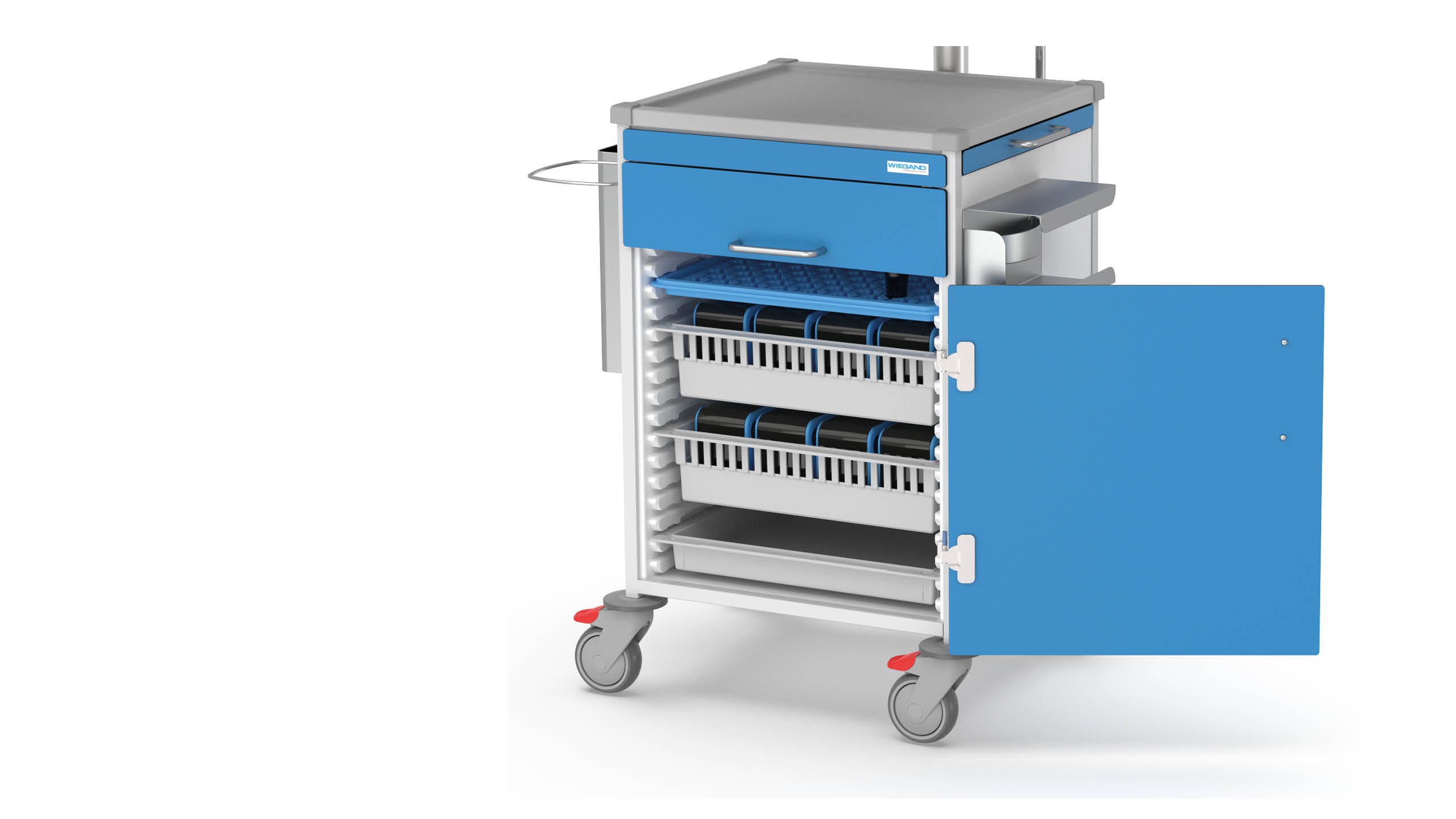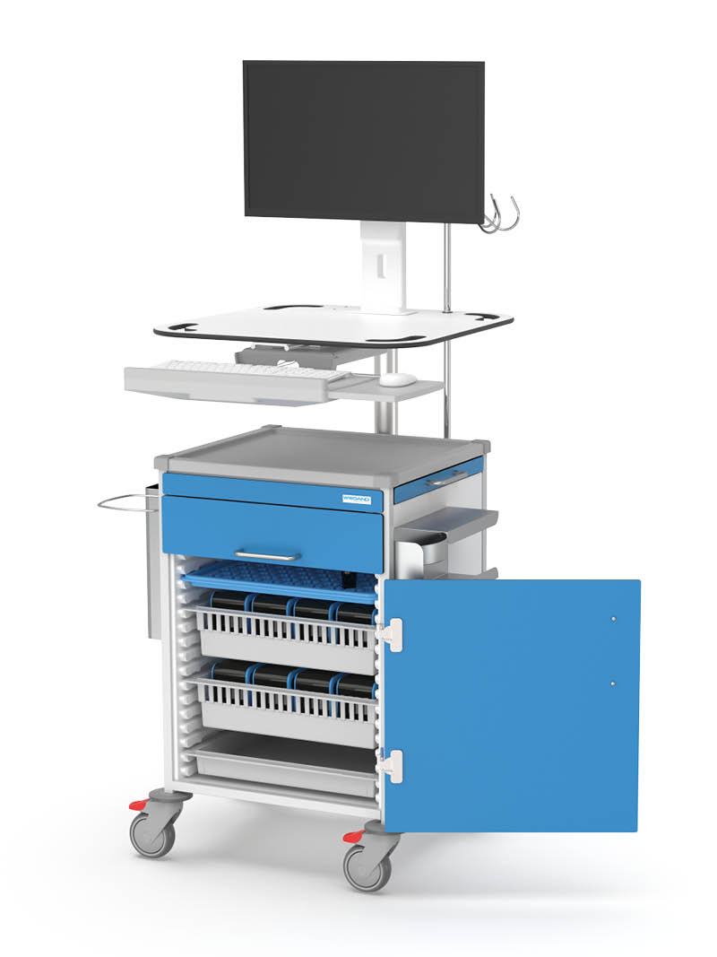 The whole range of flexibility of the Wiegand FlexLine system is available to you for configuring your MAX nursing trolley. This multi-functional nursing trolley can be optimally customised to your work processes and offers particular advantages for patient care and documentation. With plenty of storage space for medicines and equipment, the MAX nursing trolley is ideally suited for use as a mobile workstation.