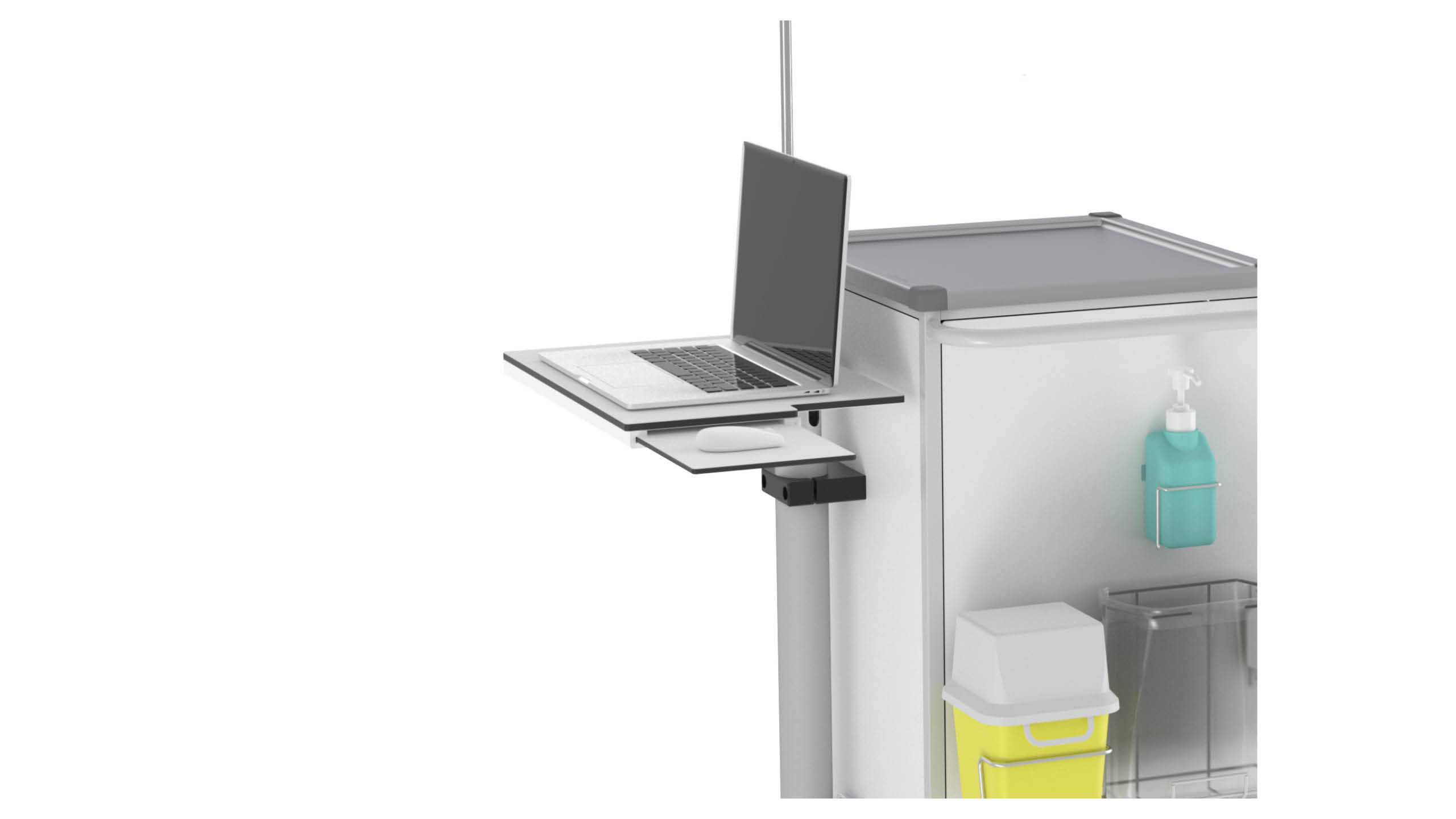 Make the MAX nursing trolley your personal ergonomic workplace. The height-adjustable, rotable table allows you to work both when seated and standing – individually adapted to your height. The side-mounted pull-out mouse tray is designed for both right- and left-handed users, while the inclinable keyboard holder promotes an ergonomic posture and makes working even more comfortable.